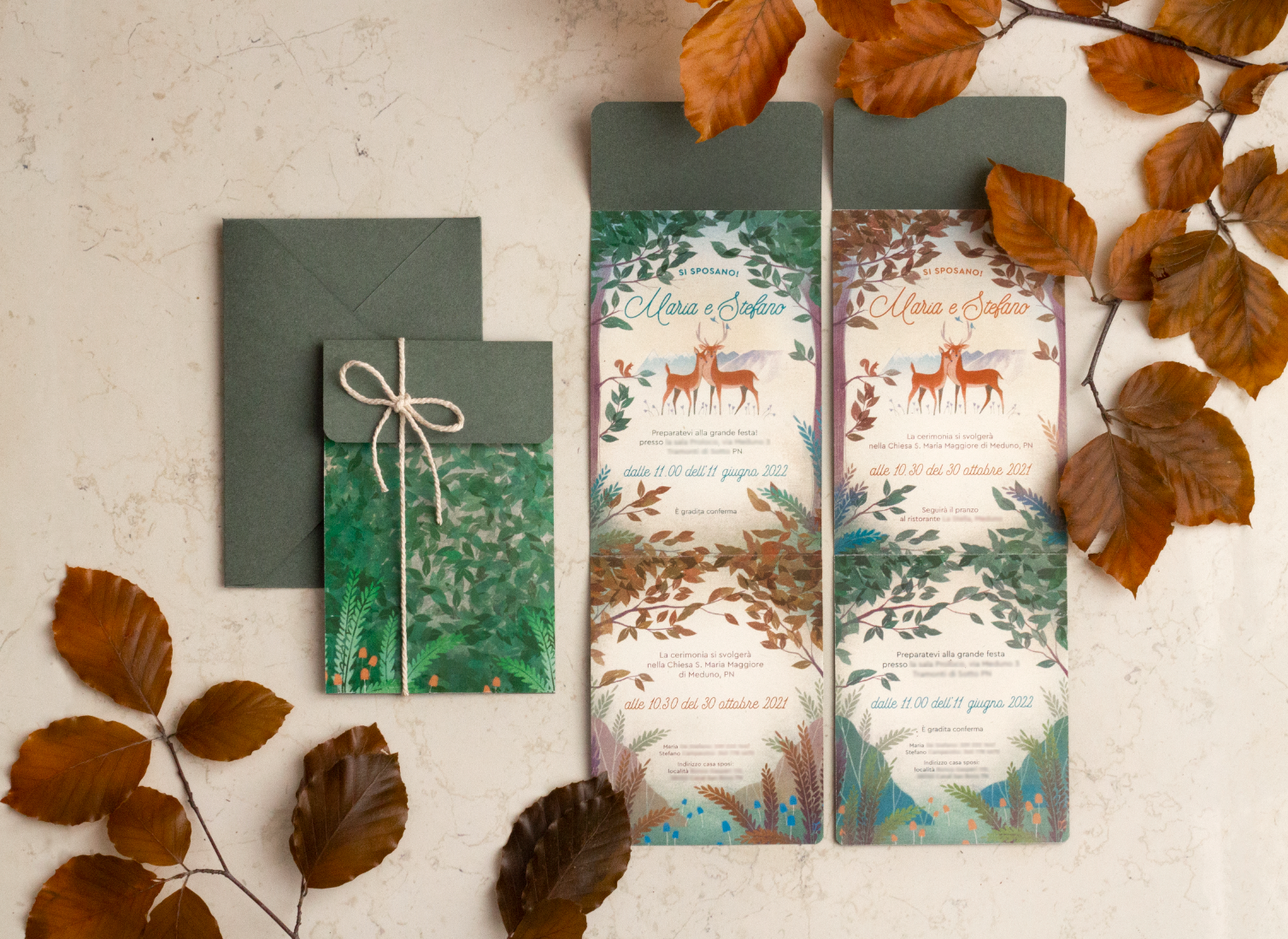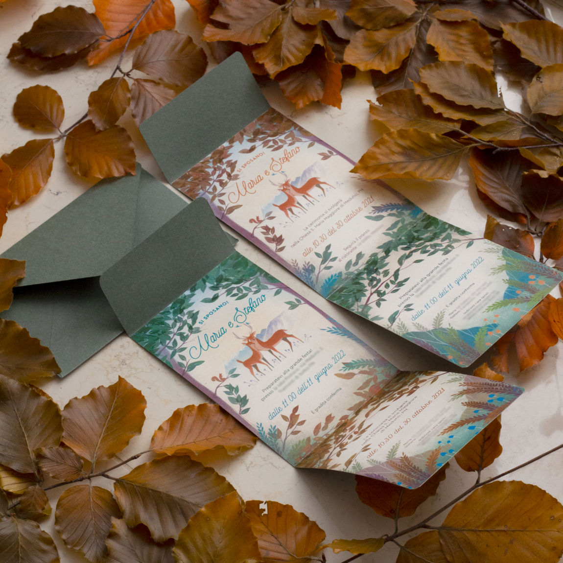 partecipazioni completamente illustrate, per portare agli invitati la magia del bosco, tanto amato dagli sposi